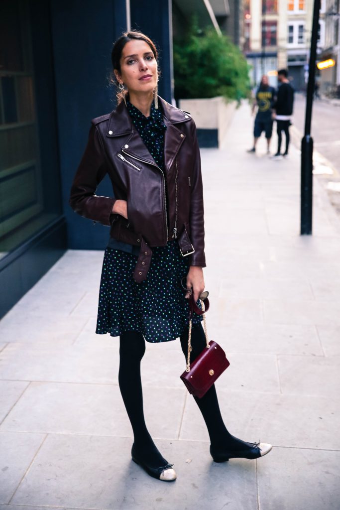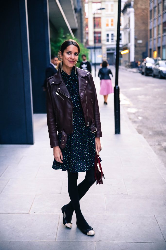 I just love this entire ensemble. The leather jacket is stunning and the dotter dress is a beautiful choice. I also love the cap toe flat shoes.