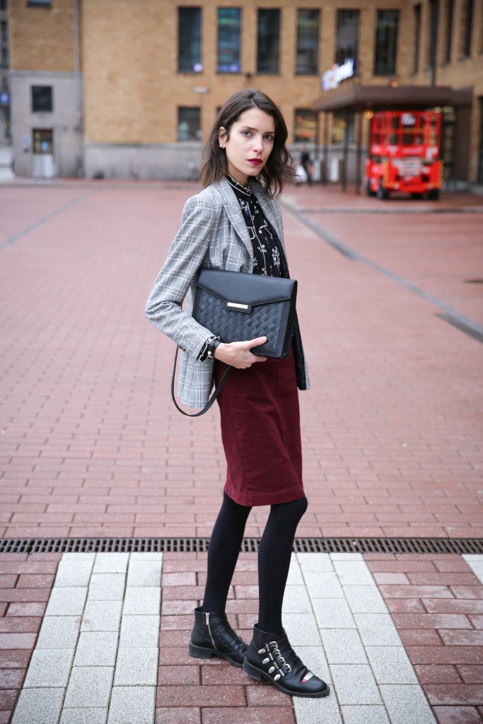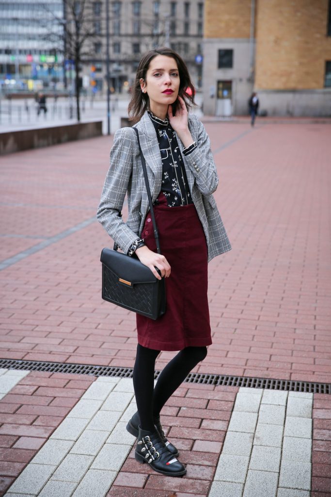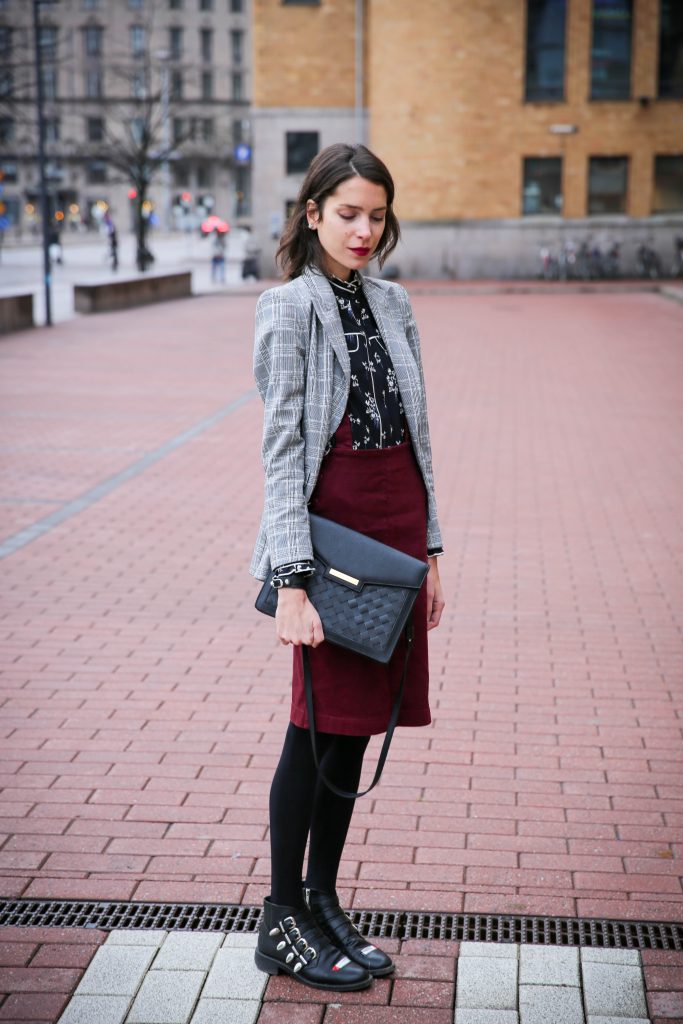 I’m wearing: Blouse (SIMILAR), Skirt (HERE), Bag (HERE), Blazer (HERE), Bracelet (HERE), Boots (HERE)