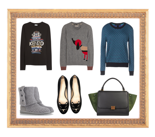 -Kenzo top -Burberry sweater -Marc by Marc Jacobs sweater -UGG boots -Charlotte Olympia flats -Celine trapeze bag