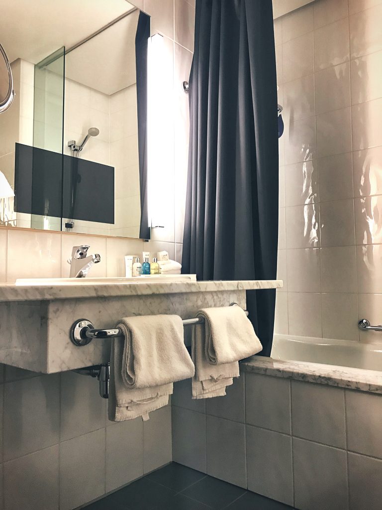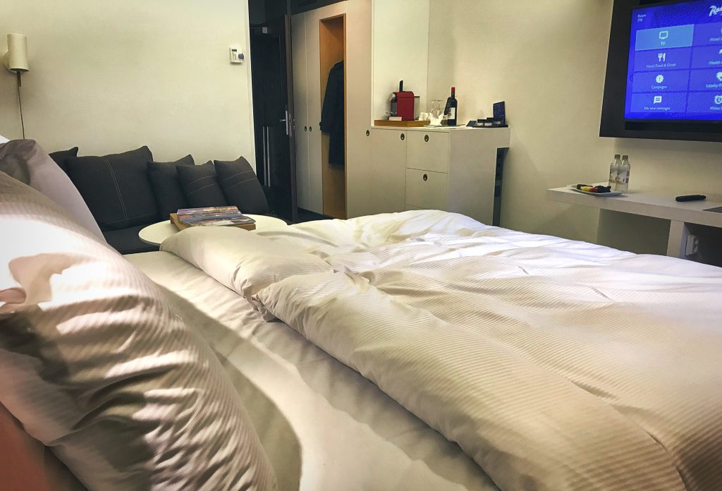 I also found it very convenient that all of the lights in the room could be adjusted on different “modes” on a mini electronic screen right next to the bed. Bathroom was well set up with the Radisson’s own toiletries and the TV screen in the bathroom mirror was a nice touch.
