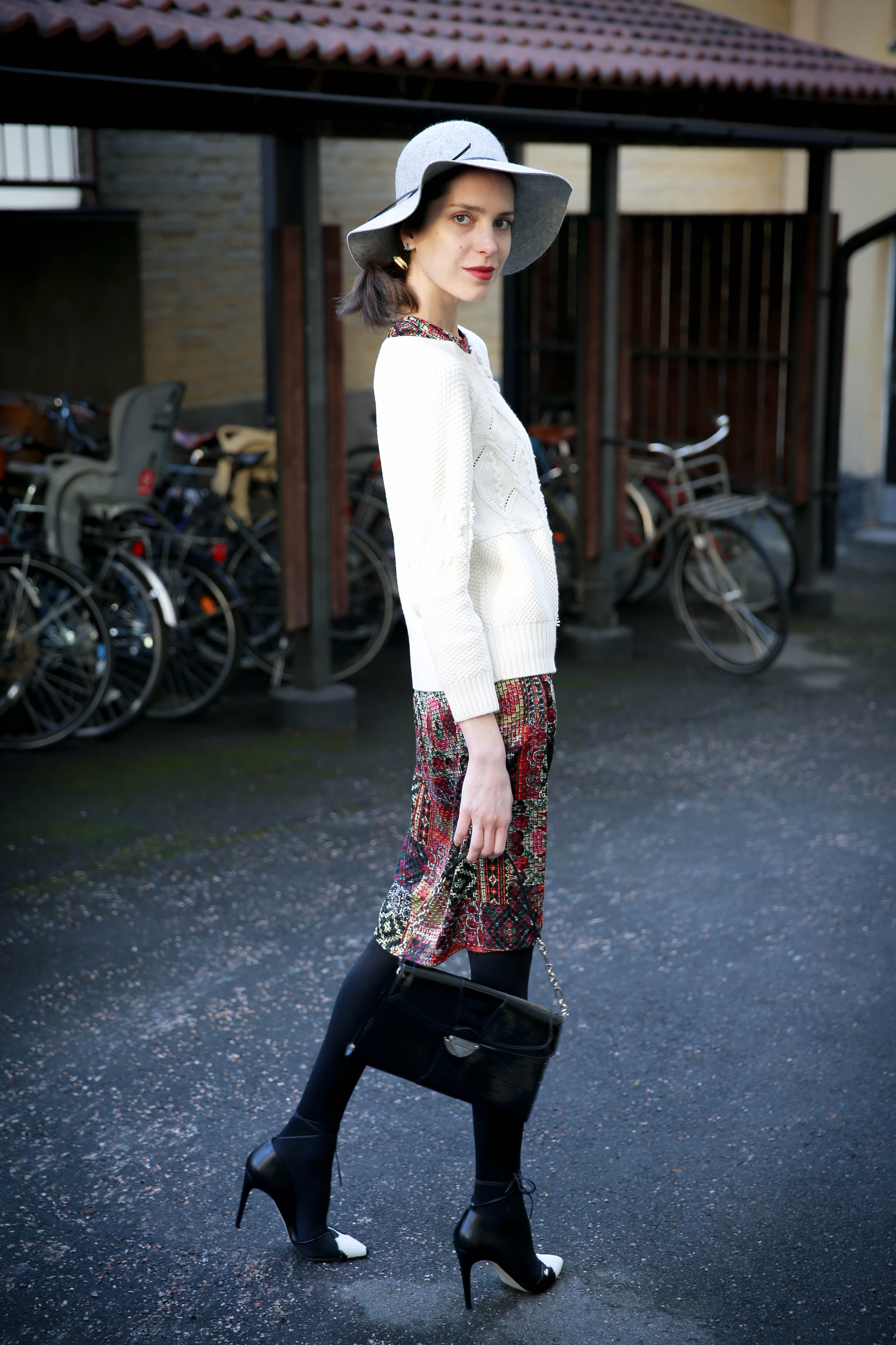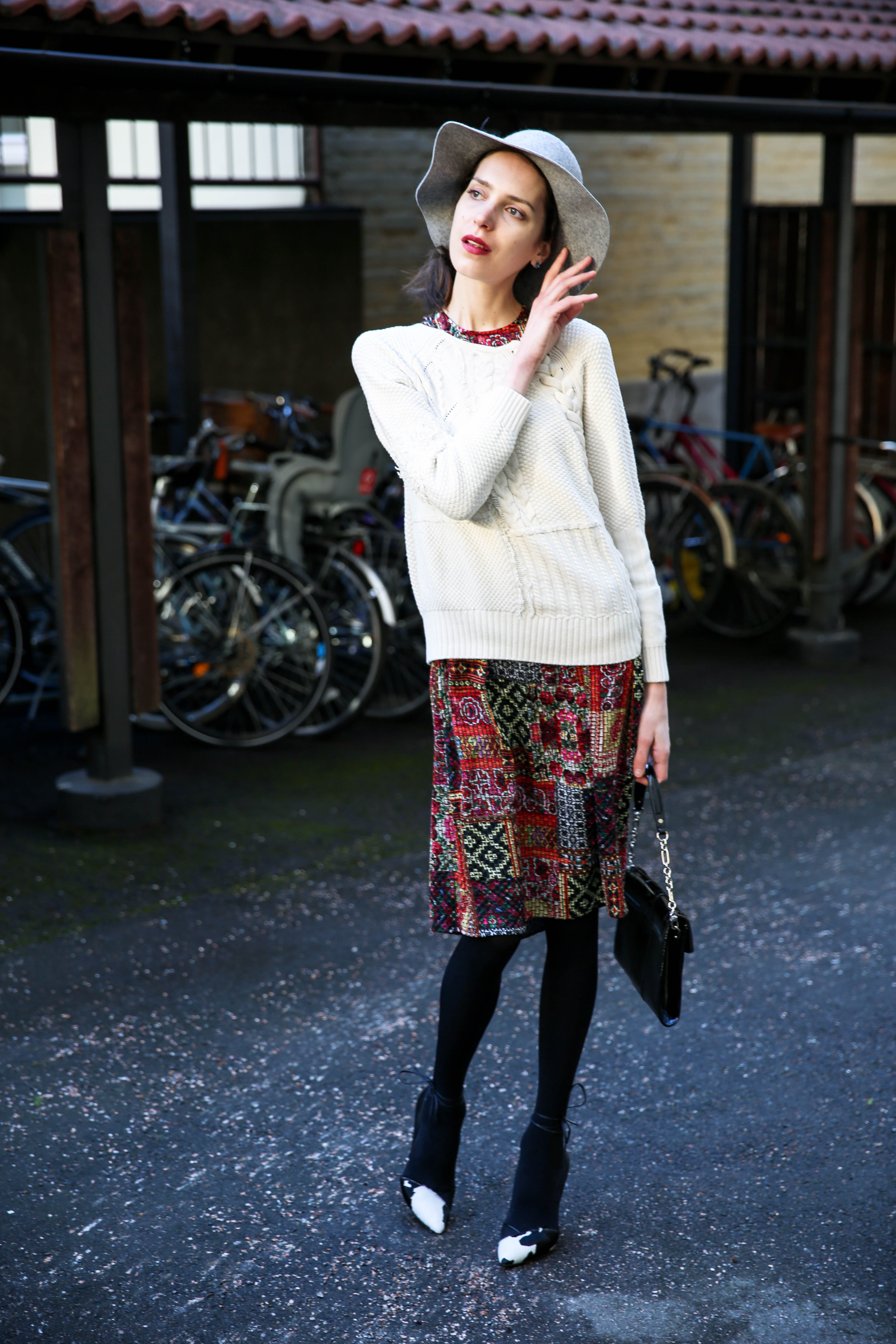 This look is so amazing, I adore the different stitches on your sweater and the pattern on the dress. So chic!