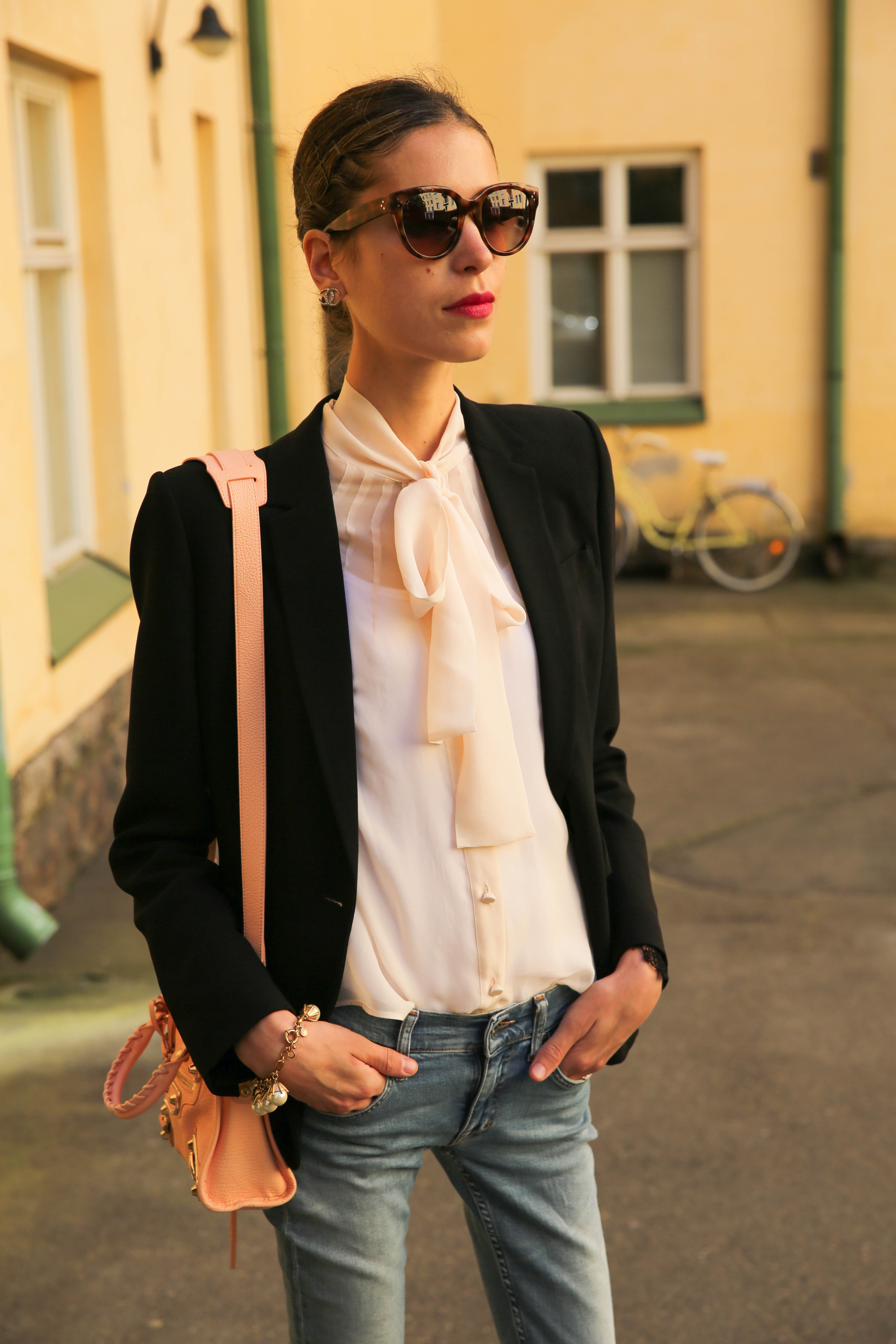 I’m wearing: Shoes - Vagabond, Blazer - Givenchy, Blouse - Max Mara, Bag - Balenciaga, Sunnies - Celine, Bracelet - JCrew, Earrings - Chanel, Jeans - Tiger Of Sweden